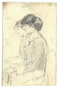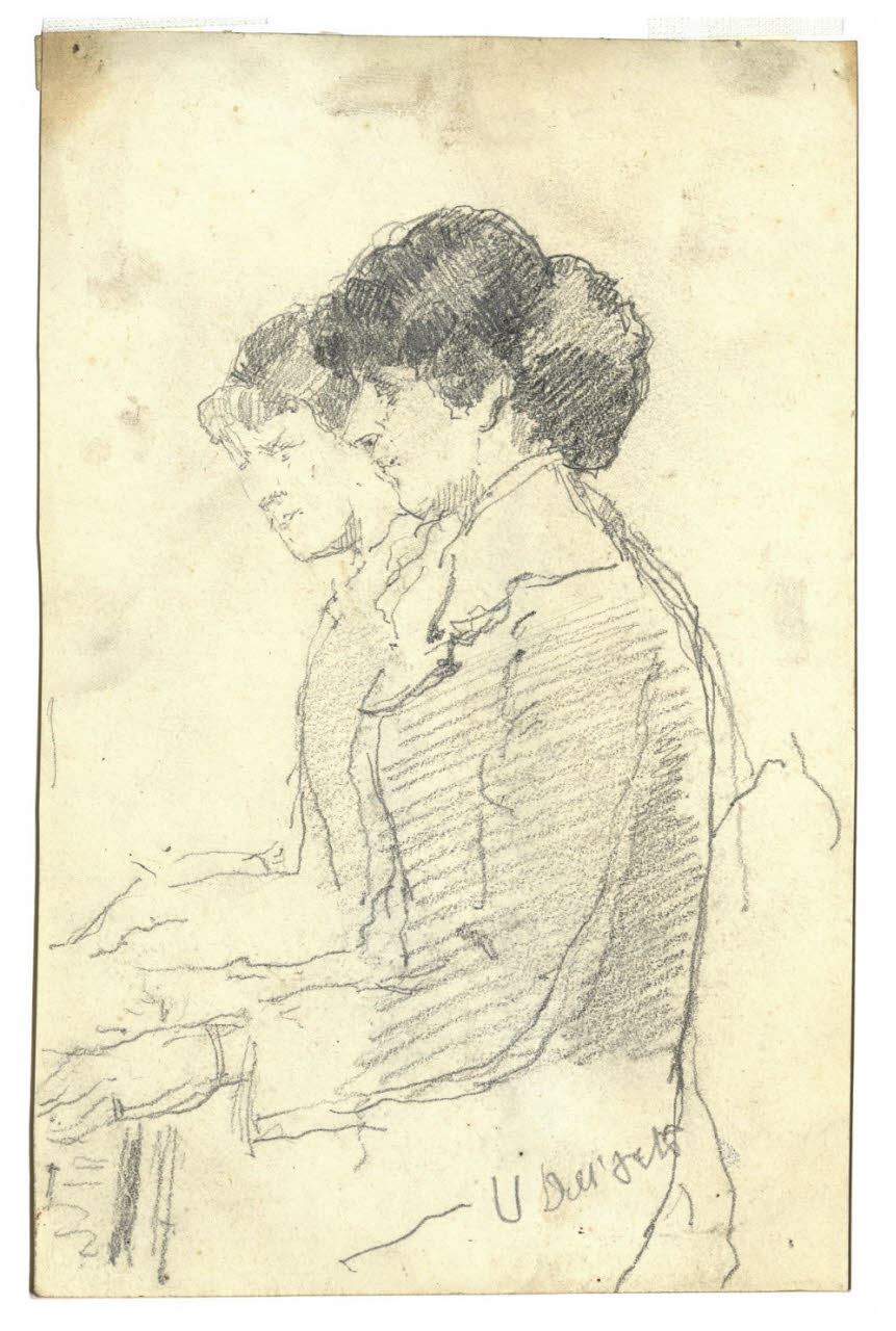 - NOTIZIE STORICO CRITICHE Nato in un'agiata famiglia milanese, Uberto Dell'Orto, dopo gli studi universitari in ingegneria condotti a Bologna, tornò nella sua città natale dove però non volle esercitare la professione, preferendo entrare nell'atelier del paesaggista Giovan Battista Lelli. Successivamente fu allievo di Eleuterio Pagliano, autore di soggetti storici molto apprezzati e ritrattista legato all'ambiente accademico.\nNel 1880 aprì uno studio in via Agnello, dedicandosi soprattutto al paesaggio e in misura inferiore al ritratto. In questo foglio, già appartenuto a Pompeo Mariani, Dell'Orto immortalò due donne sedute di profilo mentre sono intente a suonare al pianoforte. Sebbene si tratti di una scena d'interno, l'artista non offre particolari descrittivi, ma si concentra sul segno sicuro e sintetico.