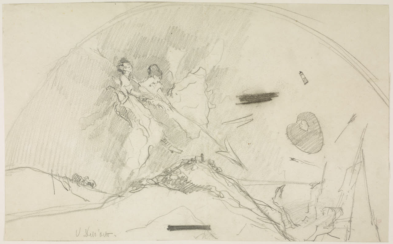 - NOTIZIE STORICO CRITICHE Già appartenuto alla collezione di Pompeo Mariani, questo foglio di Uberto Dell'Orto illustra una scena satirica con due figure femminili volanti che colpiscono con un lungo dardo un pittore mentre dipinge en plein-air in un paesaggio, fecendolo cadere a terra. Nella rovinosa caduta, l'artista ha perduto la tavolozza, i pennelli e un tubetto di colore, che ora si vedono volare sopra al cavalletto sul quale si trova ancora la tela. La composizione potrebbe essere stata disegnata da Dell'Orto come motivo decorativo per un ventaglio.