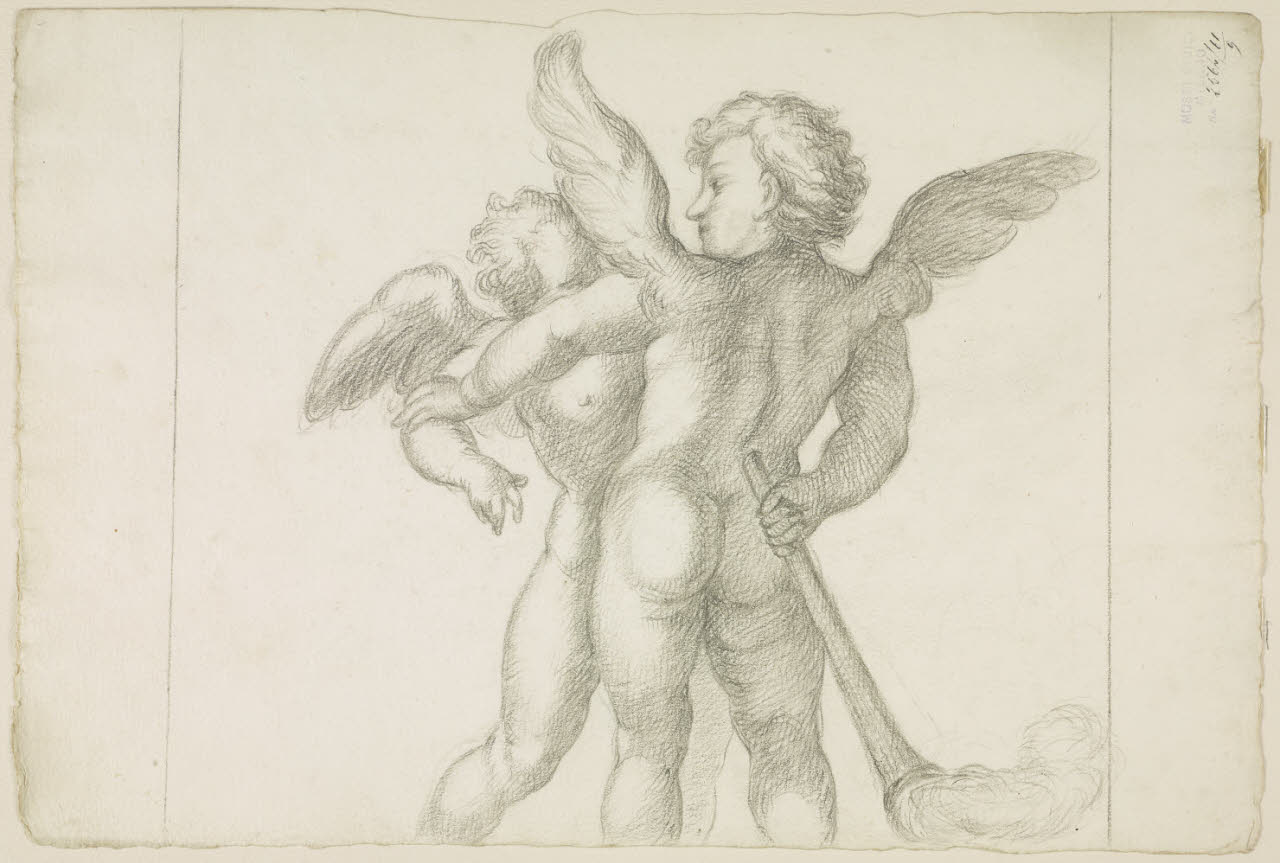 - NOTIZIE STORICO CRITICHE Sin dalla giovinezza il principe Alberico XII Barbiano di Belgioioso (1725-1813) si dedicò alle belle arti, come attestano anche alcuni suoi schizzi e taccuini di disegni, incentrati su studi di anatomia, dell'antico e di maestri del passato. In questo piccolo nucleo di fogli sono visibili derivazioni dagli affreschi di Annibale Carracci nella volta della Galleria Farnese. Il disegno è un acquisto del 1935 dalla Collezione Trivulzio.