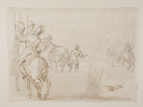 - NOTIZIE STORICO CRITICHE Attribuito nell'inventario storico della raccolta ad Aniello Falcone, in occasione di una revisione dei fogli genovesi del Gabinetto dei Disegni curata da Federica Mancini (2022) il disegno è stato ascritto a un artista dell'ambito di Giulio Benso (Giovanni Battista Montanaro?)