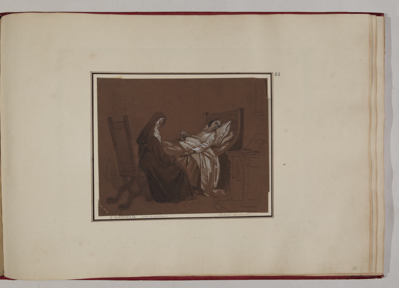 Interno di una camera con una giovane donna ammalata, a letto, assistita da una suora (inventario)