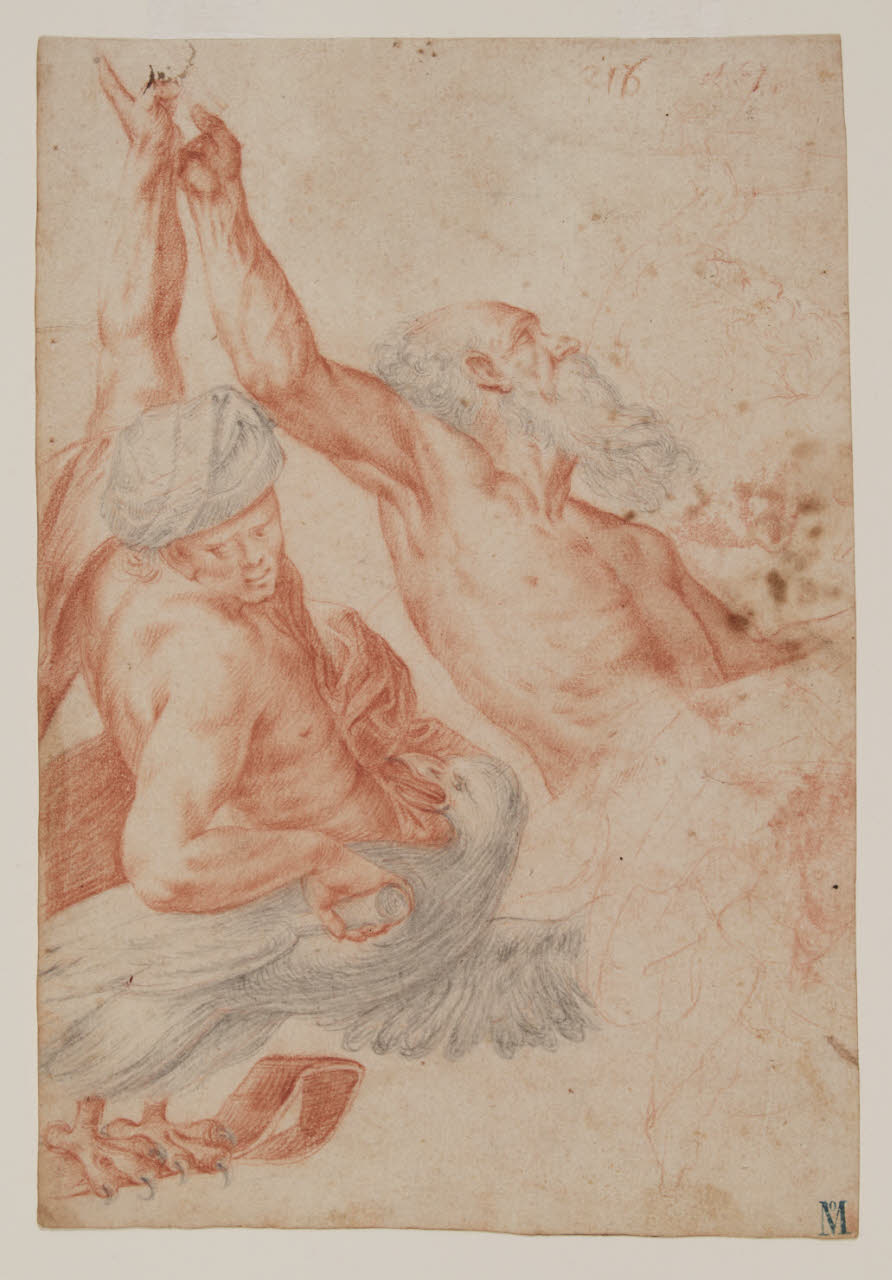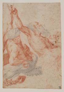 - NOTIZIE STORICO CRITICHE Il disegno è uno studio di una figura tratta dall'incisione di Cornelis Cort (1533-1578), a sua volta tratta dal "Trionfo della Trinità" (1551-1554, olio su tela) di Tiziano Vecellio (1488/1490-1576), conservato al Museo del Prado di Madrid.