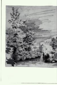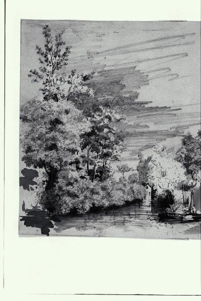 Paesaggio alberato con corso d'acqua e casolare