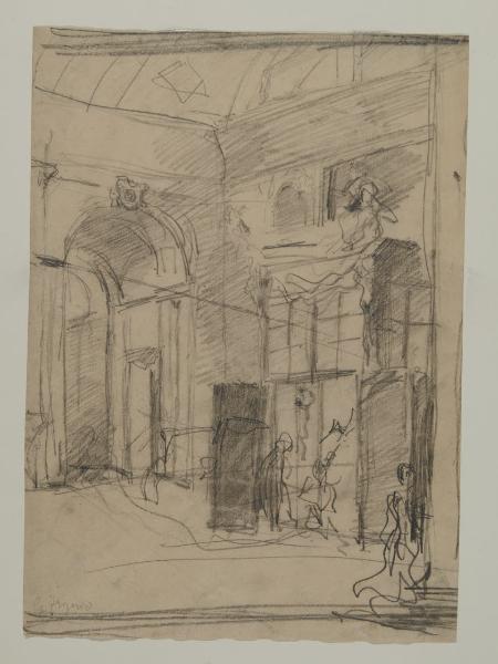 Schizzo dell'interno di una chiesa con figure abbozzate