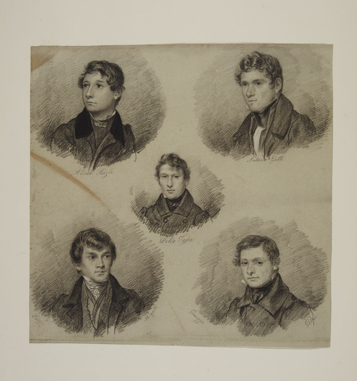 Cinque ritratti a mezzo busto: Andrea Ponzio, Antonio Galli, Delio Tessa, Luigi Bigalli, Giuseppe Gelpi