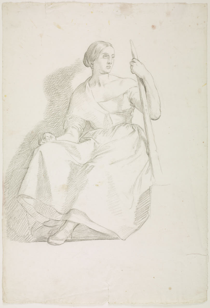 Studio di figura femminile seduta appoggiata a un bastone