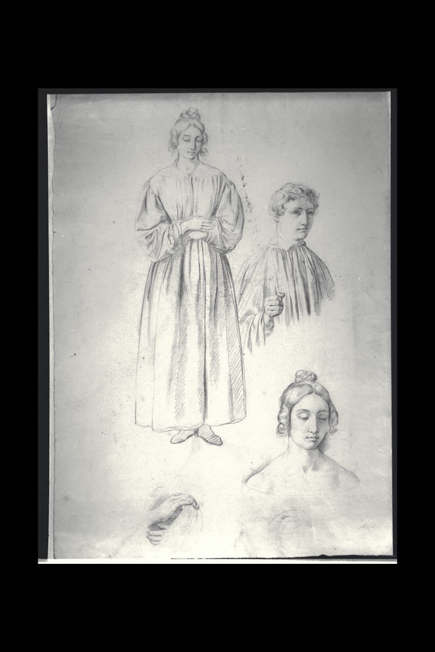 Studio di figura femminile e particolare della testa, studio di mani e giovane a mezza figura