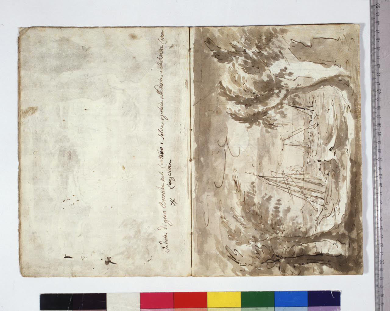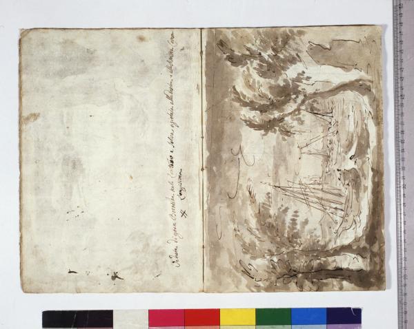 - NOTIZIE STORICO CRITICHE Grazie all'intestazione manoscritta presente sul frontespizio, e all'elenco al foglio 2, apprendiamo che l'album contiene schizzi, bozzetti, idee per l'opera "Europa riconosciuta", dramma in due atti su libretto dell'abate Mattia Verazi e musica di Antonio Salieri. Con questo titolo fu inaugurato con successo, la sera del 3 agosto 1778, il neonato Teatro alla Scala, eretto in sostituzione del distrutto Teatro Regio Ducale; le scenografie dell'opera furono curate dai fratelli Galliari.\nIl disegno rappresenta la terribile tempesta della scena I che, in apertura d'opera, ha disperso la flotta di Asterio, re di Creta, facendo naufragare lui, il figlioletto e la moglie Europa, figlia d'Agenore monarca di Tiro, su di una spiaggia deserta. Questo bozzetto di Fabrizio Galliari venne poi scelto e messo in opera per le scenografie teatrali, probabilmente per l'enfasi data all'effetto della burrasca, grazie anche allo spostamento verso il centro degli alberi laterali, più fitti rispetto all'idea precedente per creare l'illusione di una selva scossa dai venti.