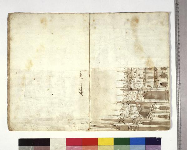- NOTIZIE STORICO CRITICHE Grazie all'intestazione manoscritta presente sul frontespizio, e all'elenco al foglio 2, apprendiamo che l'album contiene schizzi, bozzetti, idee per l'opera "Europa riconosciuta", dramma in due atti su libretto dell'abate Mattia Verazi e musica di Antonio Salieri. Con questo titolo fu inaugurato con successo, la sera del 3 agosto 1778, il neonato Teatro alla Scala, eretto in sostituzione del distrutto Teatro Regio Ducale; le scenografie dell'opera furono curate dai fratelli Galliari.\nLa didascalia è di pugno di Fabrizio Galliari, autore dei disegni dell'album.