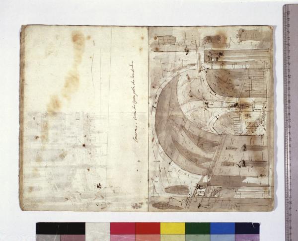 - NOTIZIE STORICO CRITICHE Grazie all'intestazione manoscritta presente sul frontespizio, e all'elenco al foglio 2, apprendiamo che l'album contiene schizzi, bozzetti, idee per l'opera "Europa riconosciuta", dramma in due atti su libretto dell'abate Mattia Verazi e musica di Antonio Salieri. Con questo titolo fu inaugurato con successo, la sera del 3 agosto 1778, il neonato Teatro alla Scala, eretto in sostituzione del distrutto Teatro Regio Ducale; le scenografie dell'opera furono curate dai fratelli Galliari.\nIl bozzetto raffigura la scena V, il carcere oscuro nel quale Asterio ed Europa attendono il verdetto del gran consiglio. La soluzione, poi scartata, risulta abbastanza convenzionale e presenta influssi bibieneschi.