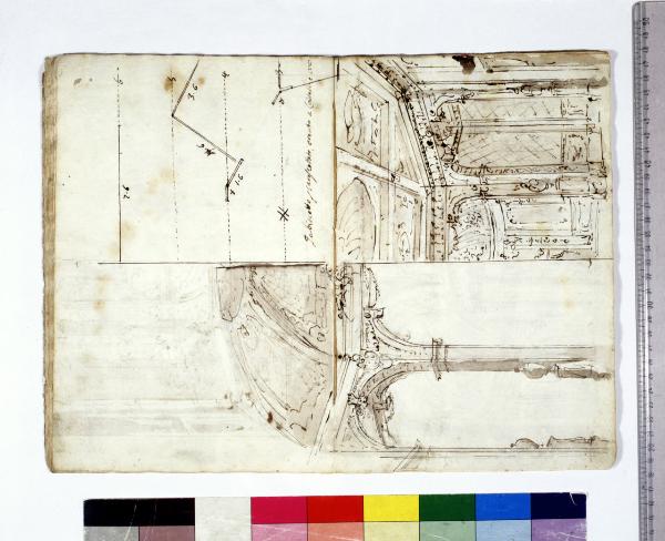 - NOTIZIE STORICO CRITICHE Grazie all'intestazione manoscritta presente sul frontespizio, e all'elenco al foglio 2, apprendiamo che l'album contiene schizzi, bozzetti, idee per l'opera "Europa riconosciuta", dramma in due atti su libretto dell'abate Mattia Verazi e musica di Antonio Salieri. Con questo titolo fu inaugurato con successo, la sera del 3 agosto 1778, il neonato Teatro alla Scala, eretto in sostituzione del distrutto Teatro Regio Ducale; le scenografie dell'opera furono curate dai fratelli Galliari.\nLo schizzo presenta l'elegante gabinetto nella reggia della scena VI, nel quale avviene l'incontro tra i due promessi sposi Semele e Isséo. Tra le due soluzioni proposte, fu alla fine adottata quella sulla destra del foglio, improntata a un aggraziato linguaggio barocchetto e riccamente ornato: l'austero soffitto cassettonato, di matrice classica, è ingentilito da ghirlande e festoni floreali, preziosi intagli, porcellane, ornati leggiadri, in una riuscita commistione tra rococò e classicismo.