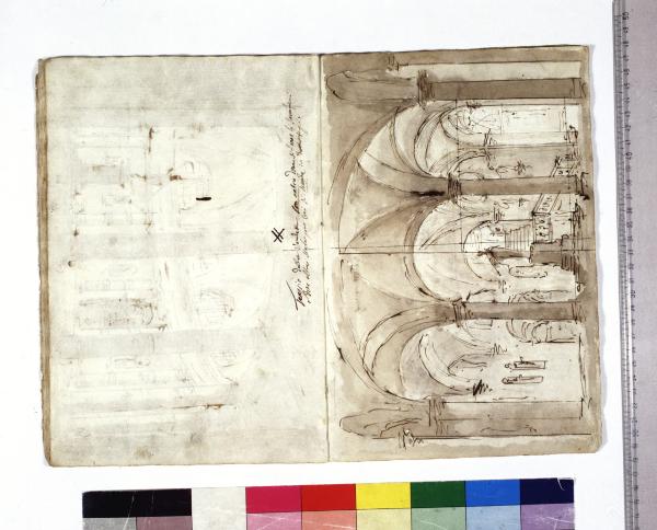 - NOTIZIE STORICO CRITICHE Grazie all'intestazione manoscritta presente sul frontespizio, e all'elenco al foglio 2, apprendiamo che l'album contiene schizzi, bozzetti, idee per l'opera "Europa riconosciuta", dramma in due atti su libretto dell'abate Mattia Verazi e musica di Antonio Salieri. Con questo titolo fu inaugurato con successo, la sera del 3 agosto 1778, il neonato Teatro alla Scala, eretto in sostituzione del distrutto Teatro Regio Ducale; le scenografie dell'opera furono curate dai fratelli Galliari.\nIl bozzetto rappresenta la scena VII con il Tempio della Vendetta, nel quale i sacerdoti di Nemesi stanno per sacrificare Asterio. Questa è l'idea poi scelta per l'esecuzione e messa in atto, e presenta parziali inserti goticheggianti che rendono l'idea di oscurità e terribilità del luogo, un complesso intreccio di colonne, archi e volte ogivali.