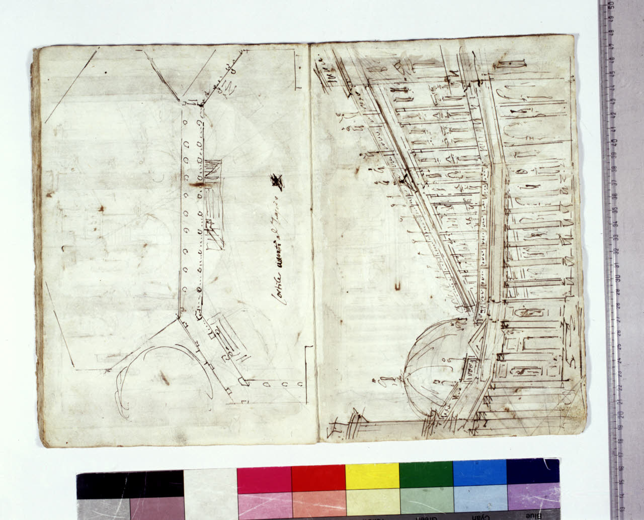 - NOTIZIE STORICO CRITICHE Grazie all'intestazione manoscritta presente sul frontespizio, e all'elenco al foglio 2, apprendiamo che l'album contiene schizzi, bozzetti, idee per l'opera "Europa riconosciuta", dramma in due atti su libretto dell'abate Mattia Verazi e musica di Antonio Salieri. Con questo titolo fu inaugurato con successo, la sera del 3 agosto 1778, il neonato Teatro alla Scala, eretto in sostituzione del distrutto Teatro Regio Ducale; le scenografie dell'opera furono curate dai fratelli Galliari.\nIl foglio mostra la pianta esecutiva del vasto cortile davanti al Tempio della Vendetta della scena VIII, nel quale avviene il duello tra Isséo e il crudele Egisto, conclusosi con la morte del nobile fenicio. In un primo tempo fu questa la soluzione scelta, come desumibile dal simbolo simile a una doppia croce o cancelletto, simbolo però poi cancellato.