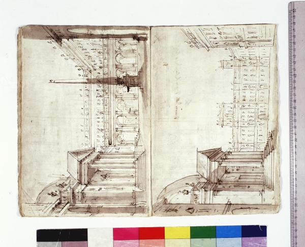 - NOTIZIE STORICO CRITICHE Grazie all'intestazione manoscritta presente sul frontespizio, e all'elenco al foglio 2, apprendiamo che l'album contiene schizzi, bozzetti, idee per l'opera "Europa riconosciuta", dramma in due atti su libretto dell'abate Mattia Verazi e musica di Antonio Salieri. Con questo titolo fu inaugurato con successo, la sera del 3 agosto 1778, il neonato Teatro alla Scala, eretto in sostituzione del distrutto Teatro Regio Ducale; le scenografie dell'opera furono curate dai fratelli Galliari.\nIl foglio mostra il bozzetto del vasto cortile davanti al Tempio della Vendetta della scena VIII, nel quale avviene il duello tra Isséo e il crudele Egisto, conclusosi con la morte del nobile fenicio. La soluzione, poi scartata, mostra affinità con altre scene a firma di Fabrizio Galliari, quelle per il melodramma "Pelopida", su musica di Giuseppe Scarlatti e libretto di Gaetano Roccaforte, rappresentato al Teatro Regio di Torino per il Carnevale del 1763.
