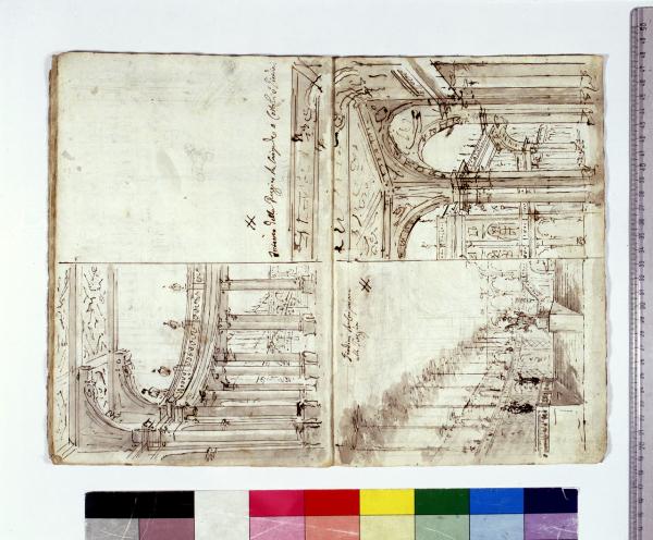 - NOTIZIE STORICO CRITICHE Grazie all'intestazione manoscritta presente sul frontespizio, e all'elenco al foglio 2, apprendiamo che l'album contiene schizzi, bozzetti, idee per l'opera "Europa riconosciuta", dramma in due atti su libretto dell'abate Mattia Verazi e musica di Antonio Salieri. Con questo titolo fu inaugurato con successo, la sera del 3 agosto 1778, il neonato Teatro alla Scala, eretto in sostituzione del distrutto Teatro Regio Ducale; le scenografie dell'opera furono curate dai fratelli Galliari.\nIl foglio mostra il bozzetto dell'ultima scena dell'opera, ambientata nella reggia di Tiro: Europa, acclamata dal popolo nuova regina, decreta l'unione tra il valoroso Isséo e Semele, e rinuncia al trono di Tiro in loro favore. Compaiono giardini terrazzati, arredi decorativi e un porticato.