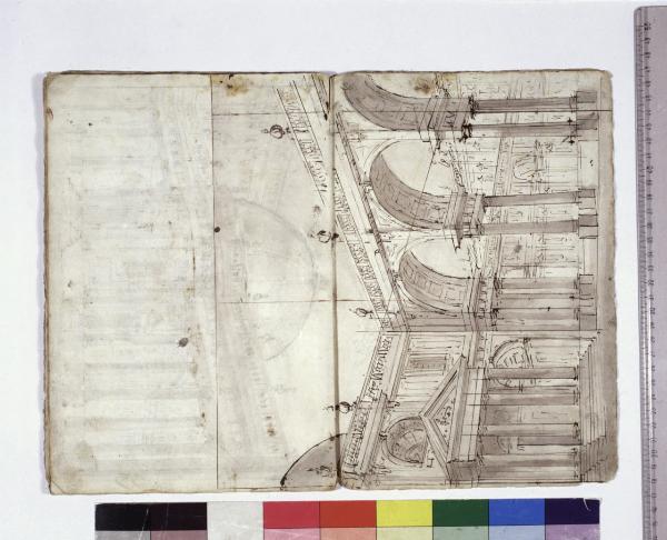 • NOTIZIE STORICO CRITICHE Grazie all'intestazione manoscritta presente sul frontespizio, e all'elenco al foglio 2, apprendiamo che l'album contiene schizzi, bozzetti, idee per l'opera "Europa riconosciuta", dramma in due atti su libretto dell'abate Mattia Verazi e musica di Antonio Salieri. Con questo titolo fu inaugurato con successo, la sera del 3 agosto 1778, il neonato Teatro alla Scala, eretto in sostituzione del distrutto Teatro Regio Ducale; le scenografie dell'opera furono curate dai fratelli Galliari.\nIl bozzetto potrebbe illustrare una variante del vasto cortile davanti al Tempio della Vendetta della scena VIII, nel quale avviene il duello tra Isséo e il crudele Egisto, conclusosi con la morte del nobile fenicio.