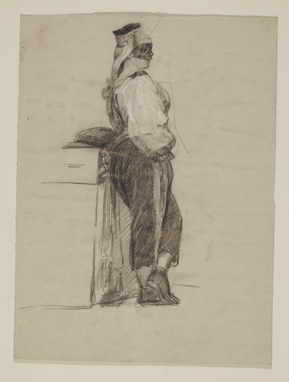 Figura femminile stante con maschera e abiti maschili