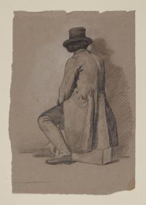 Studio di uomo seduto con cappello visto da tergo