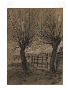 - NOTIZIE STORICO CRITICHE Accanto agli studi a olio eseguiti in Fiandra, Vittore Grubicy De Dragon realizzò una serie di paesaggi a carboncino dal tratto marcato e più robusto nella resa dei contrasti tra le zone in luce e quelle in ombra (Rebora 1995). Per alcuni di essi, come nel disegno in esame, i valori pittorici risultano molto intensi: si notino ad esempio i due alberi in primo piano che fungono da repoussoirs alla veduta retrostante, dando così un effetto di profondità alla composizione.