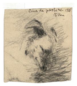 - NOTIZIE STORICO CRITICHE Nel periodo compreso tra l'estate e l'autunno del 1885, Vittore Grubicy realizzò numerosi studi ambientati nelle campagne delle Fiandre, tra cui alcuni schizzi raffiguranti scorci di paesaggi, animali e altri aspetti della vita contadina (Rebora 1995), di cui fa parte anche questo foglio in esame con la testa di un cane da pastore.