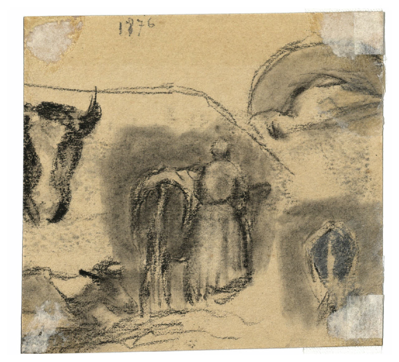 - NOTIZIE STORICO CRITICHE Nel periodo compreso tra la fine dell'estate e l'autunno del 1885, Vittore Grubicy realizzò numerosi studi ambientati nelle campagne fiamminghe, con alcuni schizzi di scorci di paesaggi, animali e altri soggetti di vita contadina, di cui fa parte anche questo disegno in esame con una donna intenta a mungere una mucca e alcuni studi di bovini.