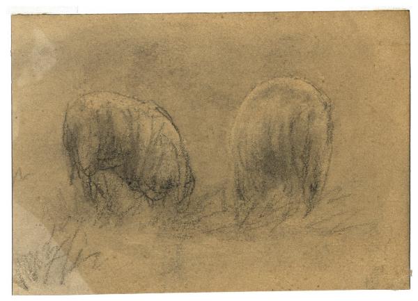 - NOTIZIE STORICO CRITICHE Nel periodo compreso tra la fine dell'estate e l'autunno del 1885, Vittore Grubicy realizzò numerosi studi ambientati nelle campagne fiamminghe, con alcuni schizzi di scorci di paesaggi, animali e altri soggetti di vita contadina, di cui fa parte anche il disegno in esame con due pecore al pascolo. Lo stesso soggetto si ritrova anche in un disegno a carboncino oggi in collezione privata (Rebora 1995, n. 264).