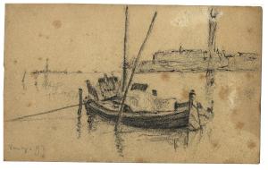 - NOTIZIE STORICO CRITICHE Nell'estate del 1897 si era svolta la seconda Esposizione Internazionale di Venezia, alla quale Vittore Grubicy prese parte con tre dipinti. In quella circostanza, l'artista si era recato nella città lagunare e vi si trattenne per un breve periodo di soggiorno, durante il quale realizzò numerosi disegni, per la maggior parte colti dalla sponda del lido e orientati in direzione della città (Rebora, 1995). Questo foglio mostra una barca ormeggiata e sullo sfondo una veduta di Venezia in cui si staglia il Campanile della Piazza San Marco.