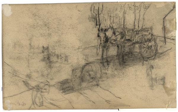 - NOTIZIE STORICO CRITICHE Il verso di questo foglio mostra lo studio di un carro agricolo trainato da un cavallo su una strada alla periferia di una città, probabilmente da identificare in Scheweningen, località nei pressi dell'Aja, dove Vittore Grubicy realizzò alcuni disegni dal vero nell'autunno del 1884 (Rebora 1995).