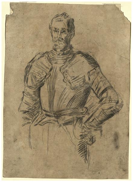 - NOTIZIE STORICO CRITICHE Il foglio mostra un guerriero medievale ripreso frontalmente a mezza figura con entrambe le mani portate ai fianchi.