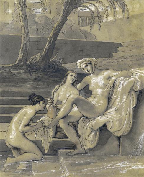 - NOTIZIE STORICO CRITICHE Questo disegno, tra gli esempi più alti della produzione grafica di Francesco Hayez, giunse nelle raccolte dei Musei Civici nel 1862 con la collezione e le opere dello scultore Pompeo Marchesi. Già segnalato da Nicodemi, il disegno in questione venne messo in relazione ad un soggetto biblioco molto caro ad Hayez, "La Betsabea al bagno", trattato dall'artista più volte a partire dal 1827. Rispetto alle due redazioni pittoriche conosciute del tema (Lugo Vicentino, coll. privata; Milano, Pinacoteca di Brera (Reg. Cron. 6332)), il disegno rifinitissimo del Castello Sforzesco presenta sensibili varianti compositive: le pose delle figure sono pressoché identiche, ma le due ancelle che assistono Betsabea sono completamente nude, senza copricapi, né ornamenti. Inoltre, il paesaggio è ora sostituito da una complessa elaborazione architettonica organizzata per piani digradanti che mostra, al di là dei palmizi, il palazzo reale dalla cui loggiata si vede affacciarsi il re David, intento ad osservare proprio Betsabea della quale poi si invaghì. Il disegno era forse un primo modello di presentazione per il dipinto del 1834, oggi in collezione privata, ma non si può neppure escludere che fosse invece destinato alla traduzione litografica (Rossi 2015). Le acquarellature nere e brune sapientemente modulate si accompagnano a segni puramente grafici che risaltano sulla suferficie: mentre la penna nera delinea le forme, i tratteggi di biacca, incrociati e paralleli, definiscono i colpi di luce sulle figure nude in primo piano e nel cielo in alto. L'episodio biblico diviene allora puro pretesto per un esercizio di retorica accademica con chiari riferimenti puristi e rimandi al classicismo bolognese, tra Reni e Domenichino.\nPresso l'Accademia di Brera si conservano quattro fogli di studi a carboncino e gessetto bianco in cui Hayez elaborò le pose dei singoli modelli femminili. Uno di questi fa parte del terzo e ultimo taccuino dell'autore noto come "Taccuino giallo" risalente al 1830-1834, una datazione coerente con la cronologia proposta anche per il disegno del Castello (Rossi 2015).