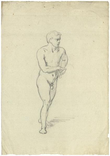 - NOTIZIE STORICO CRITICHE Il foglio rappresenta un abbozzo di una figura virile, una gamba avanzata rispetto all'altra, mentre è in atto di afferrare l'impugnatura di un'arma, probabilmente una spada. Lo studio, già attribuito a Francesco Hayez nell'inventario museale redatto da Giorgio Nicodemi, e oggi riferibile ad un anonimo artista del XIX secolo, pare essere un esercizio accademico di nudo.