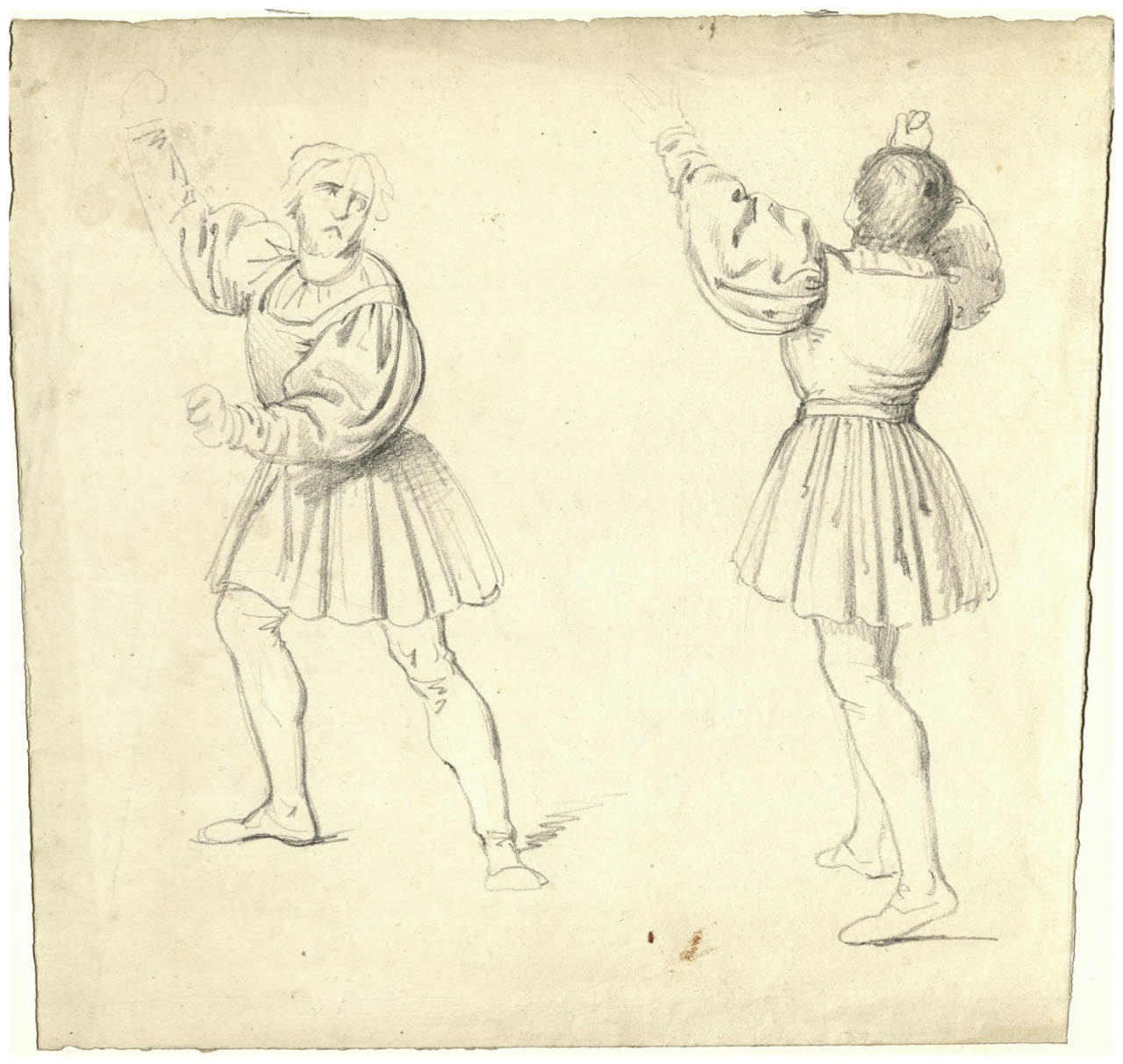 - NOTIZIE STORICO CRITICHE Il foglio illustra due figure maschili, una vista frontalmente e l'altra di tergo, in abiti quattrocenteschi.