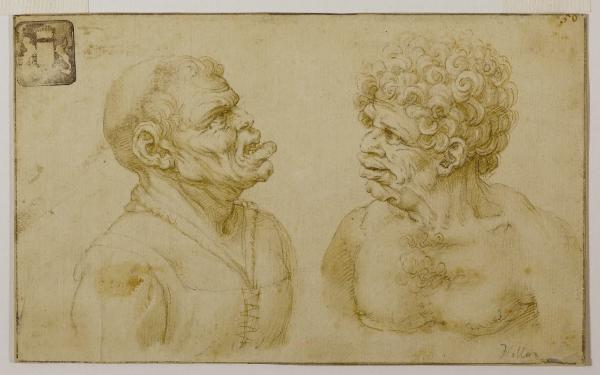 - NOTIZIE STORICO CRITICHE Nell'inventario del Gabinetto dei Disegni del Castello risalente agli anni Trenta del Novecento quest'opera risulta attribuita all'incisore originario di Praga Wenzeslaus Hollar (1607-1677). \nIl suo nome risulta effettivamente presente sul foglio, in basso a destra, apposto a matita in tempi antichi: questo probabilmente in virtù della somiglianza con alcune serie di stampe che durante il periodo trascorso dall'incisore in Inghilterra, Hollar aveva tratto da disegni originali nella collezione di Thomas Howard, conte di Arundel.\nLa figura a destra è copiata abbastanza fedelmente da un frammento di Leonardo oggi conservato all'Albertina di Vienna (inv. 66), mentre quella a sinistra non ha un corrispettivo nel repertorio del maestro di Vinci, dal quale l'autore ha evidentemente attinto in modo generico.\nAcquistato dal Comune di Milano nel 1931 presso gli eredi del bergamasco Paolo Gaffuri, fondatore dell'Istituto Italiano di Arti Grafiche, questo disegno originariamente formava una serie con almeno altri tre fogli di soggetto analogo e delle stesse dimensioni e antica provenienza. Questi sono oggi conservati a Edimburgo presso la National Gallery of Scotland. Il nucleo scozzese - al quale (per stile e marchi di collezione) si può accostare anche il nostro foglio - risulta espunto dal recente catalogo dei disegni di Hollar (Alena Volrabova, "Wenceslaus Hollar 1607-1677. Drawings. A Catalogue Raisonné", Narodni galerie v Praze, Praga 2017, p. 424, nn. A.II/105-107), e trattato come opera di un anonimo del XVII secolo. Tutti e quattro i disegni presentano in alto a sinistra un timbro a inchiostro nero, che nei repertori è stato ricondotto, seppure dubitativamente, a Johannes von Ross, un amatore d'arte vissuto a Berlino nella prima metà del XIX secolo (F. Lugt, "Les Marques de Collections de Dessins et d'Estampes", 1921, n. 2693).