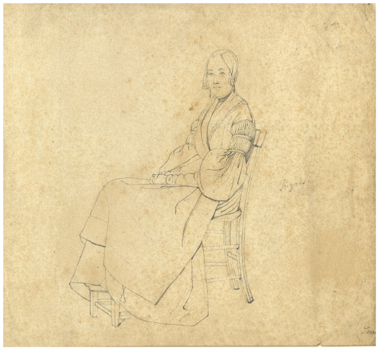 - NOTIZIE STORICO CRITICHE Già appartenuto alla collezione di Augusto Lurati, questo disegno attribuito a Ingres illustra il ritratto di una donna seduta di tre quarti verso sinistra, con il volto visto frontalmente, mentre tiene le mani conserte in grembo e poggia i piedi su poggiapiedi.