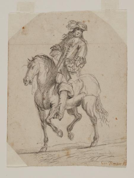 - NOTIZIE STORICO CRITICHE Appartenuto alla collezione di Paolo Gaffuri, questo disegno a matita di Johann Anton Eismann illustra un gentiluomo a cavallo. Il foglio faceva probabilmente parte, come i disegni Au. A 1409, A 1410 e A 1411, di un taccuino di viaggio, nel quale l'artista vi registrava studi dal vero, sfruttati poi per diverse macchiette che compaiono nelle sue tele. La figura del cavaliere nella stessa posa disinvolta, o simile, si ritrova impiegata dall'artista in diversi suoi dipinti (cfr. Safarik 1976, cat. nn. 16, 51, 55, 68).