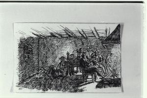 Gruppo di persone intorno al focolare in una locanda