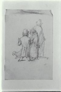 Caricatura di due uomini e una donna con cagnolino