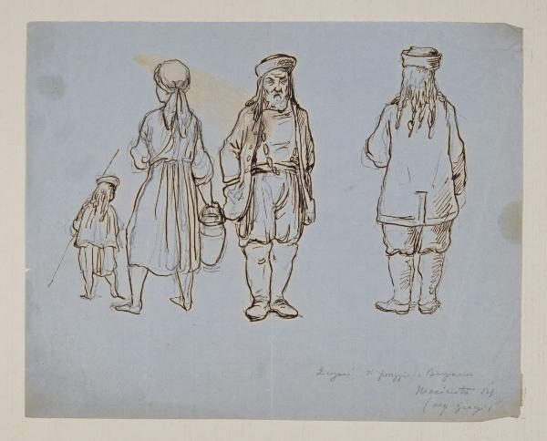 Una figura maschile vista di fronte e di tergo, una giovanetta e una bimba viste di tergo