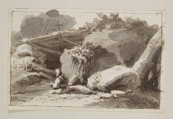 Paesaggio roccioso con frate seduto