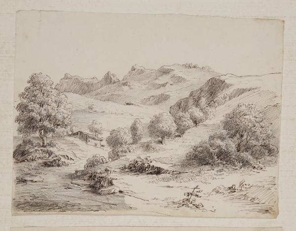 Paesaggio montuoso alberato con casolare