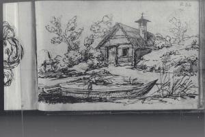 Paesaggio con corso d'acqua e chiesetta rustica