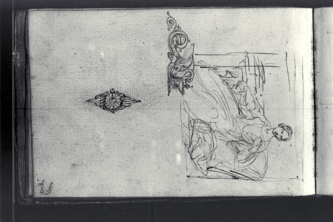 Figura femminile seduta e due motivi decorativi