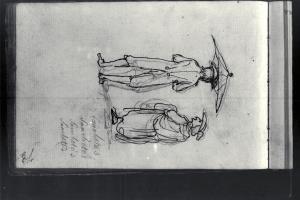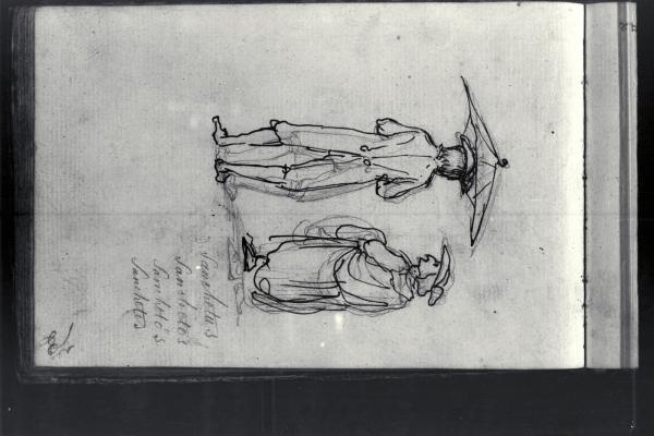 Figura maschile con ombrello aperto e prete di profilo