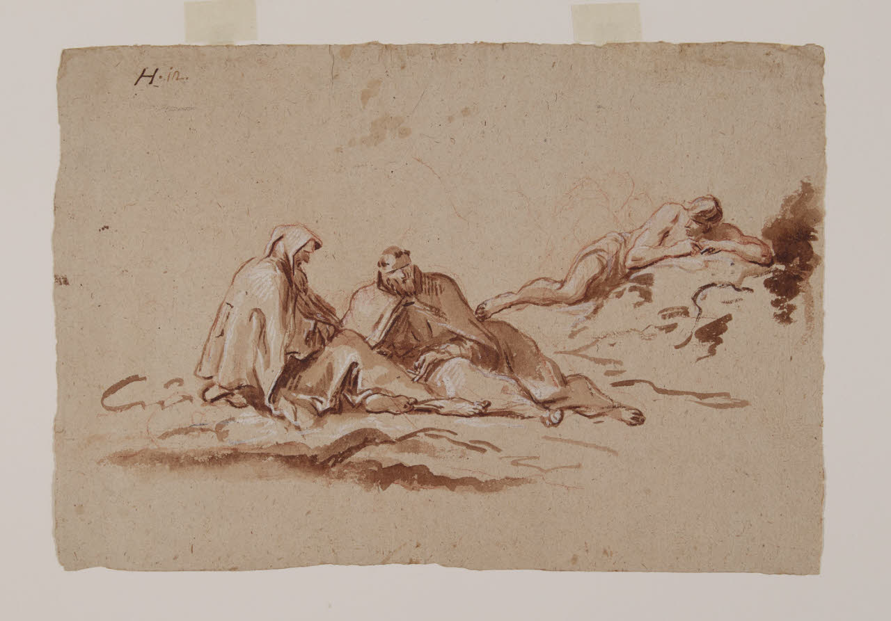 pennello, inchiostro bistro, lumeggiature di biacca e tracce di sanguigna su carta tinta paglierina