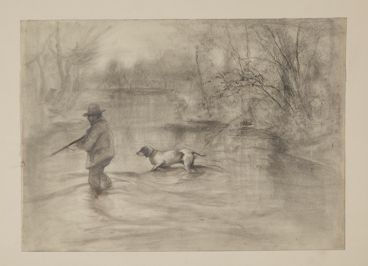 Cacciatore con cane che attraversa un corso d'acqua