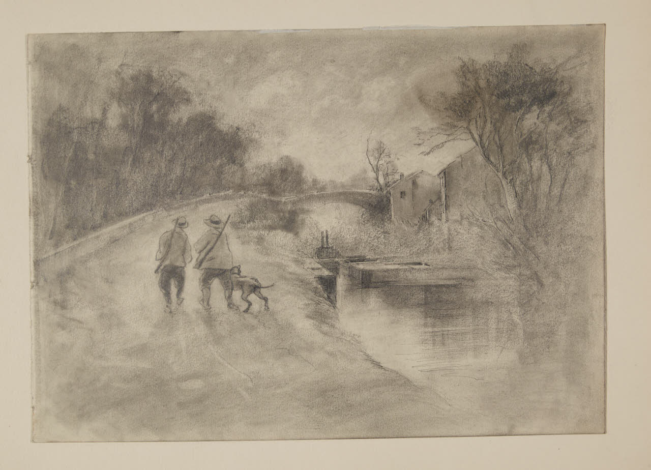 Canale e strada alberata con cacciatori di ritorno dalla caccia