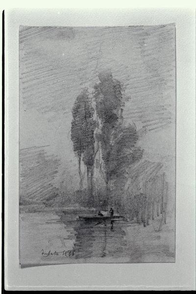 Paesaggio fluviale con riva alberata e barchetta