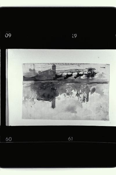 carta a righe/ pietra nera/ pennello e inchiostro/ acquerellature