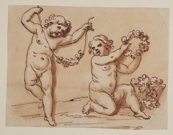 Due putti con un festone e una corona. Due putti con festone e corona
