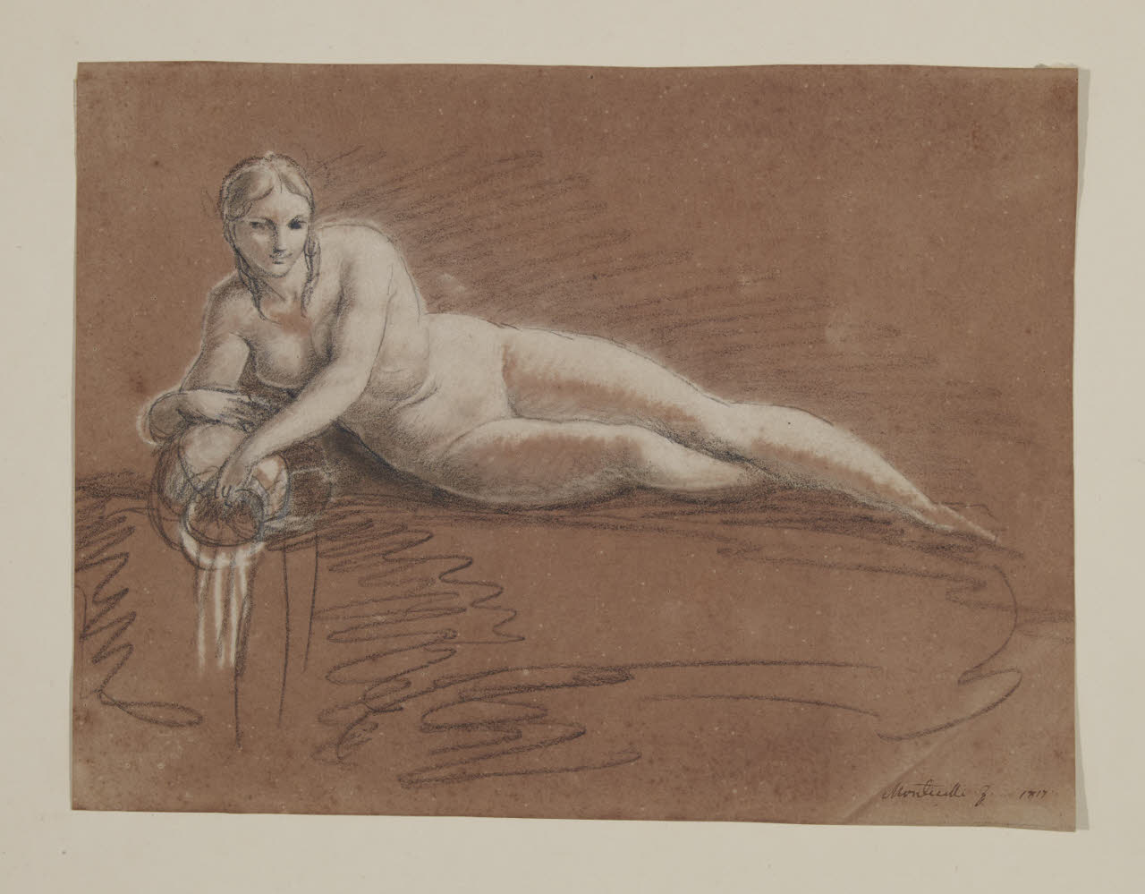 Donna nuda giacente che versa acqua da un'anfora. Figura allegorica di donna nuda giacente che versa acqua da un'anfora